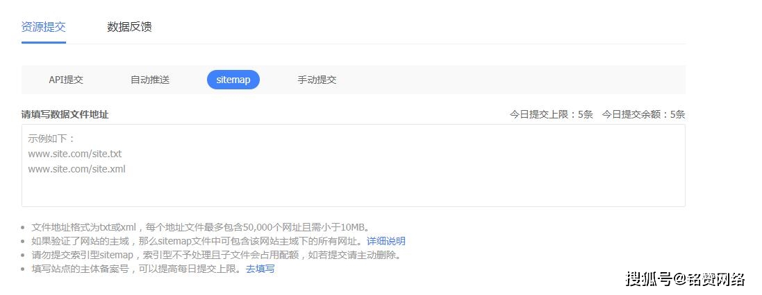 文件地址格式為txt或xml,每個地址文件最多包含50,000個網(wǎng)址且需小于10MB。